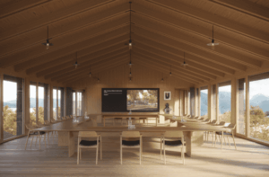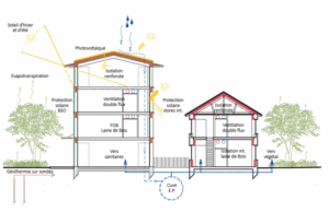 Le bâtiment est conçu avec une façade à ossature bois (FOB) isolée en laine de bois, garantissant de hautes performances thermiques et acoustiques tout en utilisant des matériaux écologiques. Le système de chauffage repose sur la géothermie, grâce à des sondes verticales permettant une production d’énergie renouvelable et efficace. Enfin, le confort d’été est assuré par un rafraîchissement passif utilisant la ventilation naturelle, qui favorise la circulation de l’air sans recours à la climatisation mécanique.